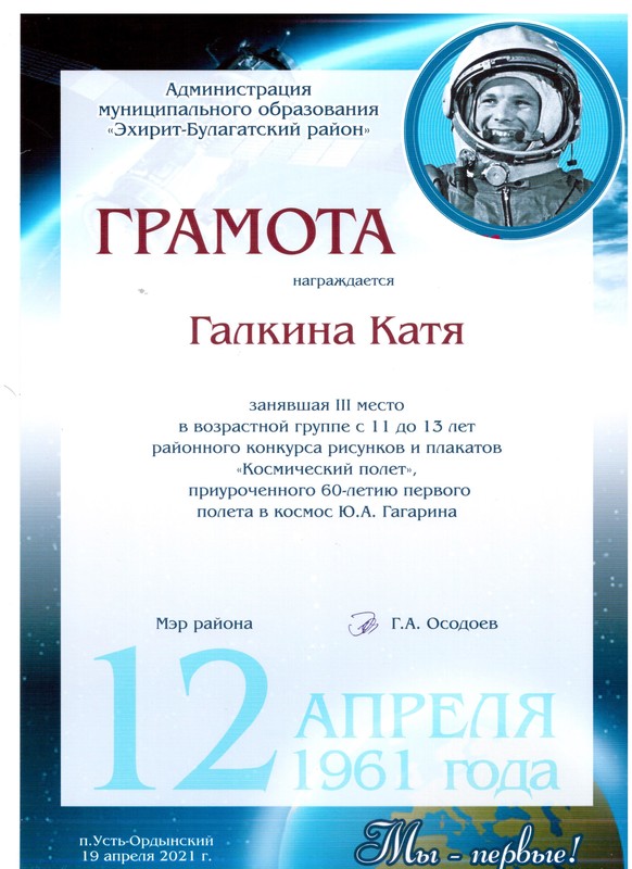 28 апреля 2021 г. состоялось вручение наград и призов победителям районного конкурса рисунков и плакатов «Космический полёт», посвященного 60-летию первого полета в космос Ю.А. Гагарина. Итоги конкурса были подведены 20 апреля 2021 г.