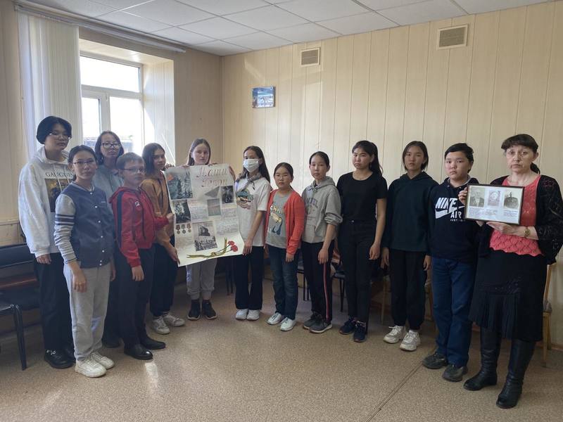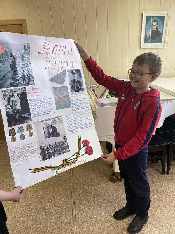 Виктория Викторовна познакомила хористов с мемориальными комплексами «Хатынь» (Белоруссия), «Мамаевом кургане» (г. Волгоград, Россия). Вспомнила о своем прадедушке Елисееве Иване Федоровиче 1905 г.р., участнике Советско-Финской войны 1939 – 1940 гг., инвалиде войны, имевшем много наград. Дедушках Белобородове Степане Никифоровиче (1918 – 1997), старшем сержанте, командире расчета 209 стрелковой дивизии, дважды раненым, воевавшим с 1938 по 1947 гг., награжденным орденами Отечественной войны I ст., Красной звезды, орденом «Славы» III ст., медалями «За отвагу», «За боевые заслуги» и Донец Михаиле Андреевиче (1907 – 1982), командире отделения, ветфельдшере, воевавшем с 1942 по 1947 гг., имевшем награды. Во время рассказа преподавателя учащиеся посмотрели фоторяд о событиях Великой Отечественной войны.