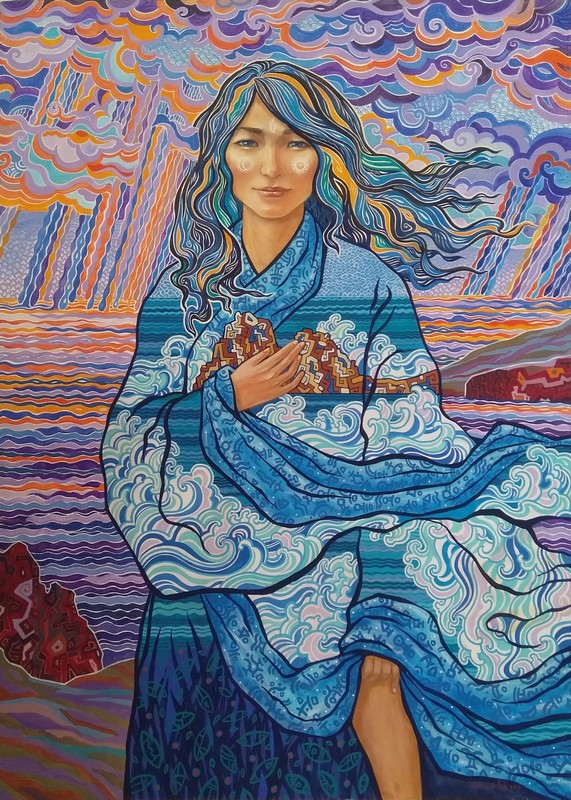 Е. Асалханова обращается в своем творчестве к буддийским и шаманским образам и мотивам, используя философские, нравственные идеи, заключенные в традиционных символах. На выставке представлены работы разных лет, показывающие опыт изучения и трансформации традиционной бурятской живописи «буряад зураг». В соседнем зале представлены некоторые экспонаты из буддийского собрания музея, одну из стен заняли картины Е. Асалхановой с изображением буддийских божеств, написанные в соответствии с каноном. Картина «Сагаан Убэгэн. Белый Старец» написана в технике масляной живописи, что не характерно для «буряад зураг», демонстрируя новые возможности развития традиционной живописи: хозяин земли, покровитель рода, растительного и животного мира написан на фоне условного зимнего пейзажа. На создание картины «Буха-нойон. Небесный бык» (2021. Холст, масло. 100х120) оказала влияние традиция бурятских монументальных буддийских танка, для которых характерны гармоничные сочетания больших локальных цветовых пятен, ясная композиция. Авторскую художественную роспись по дереву можно увидеть в работе «Молитва» (Лошадка-каталка. 2007. Дерево, гуашь, темпера).
