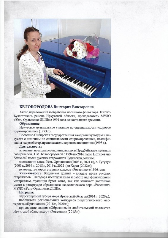 Так называется авторский фольклорный сборник Виктории Викторовны Белобородовой преподавателя МУДО «Усть-Ордынская ДШИ», выпущенный Иркутским областным Домом народного творчества (ГБУК «ИОДНТ») из серии «Фольклор Иркутской области» (выпуск 15). Научный редактор Н. М. Белобородова, кандидат исторических наук; редактор Н. В. Разумная, корректор ГБУК «ИОДНТ». Рецензенты: М. А. Карышева, заслуженный работник культуры и искусства Иркутской области, зам. директора по научно-методической деятельности Иркутского музыкального колледжа им. Ф. Шопена; Е. А. Баруткина, руководитель коллектива самодеятельного искусства и Н. В. Дмитриева, ведущий специалист по жанрам творчества ГБУК «ИОДНТ».
