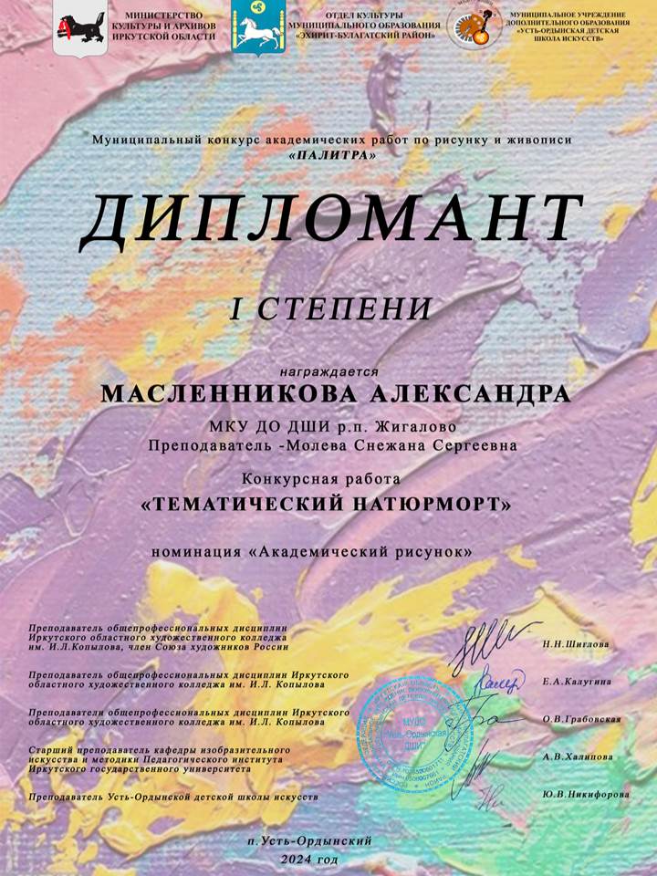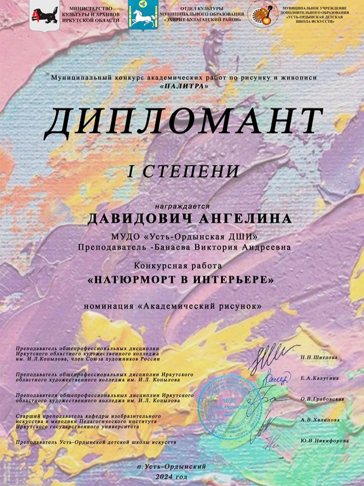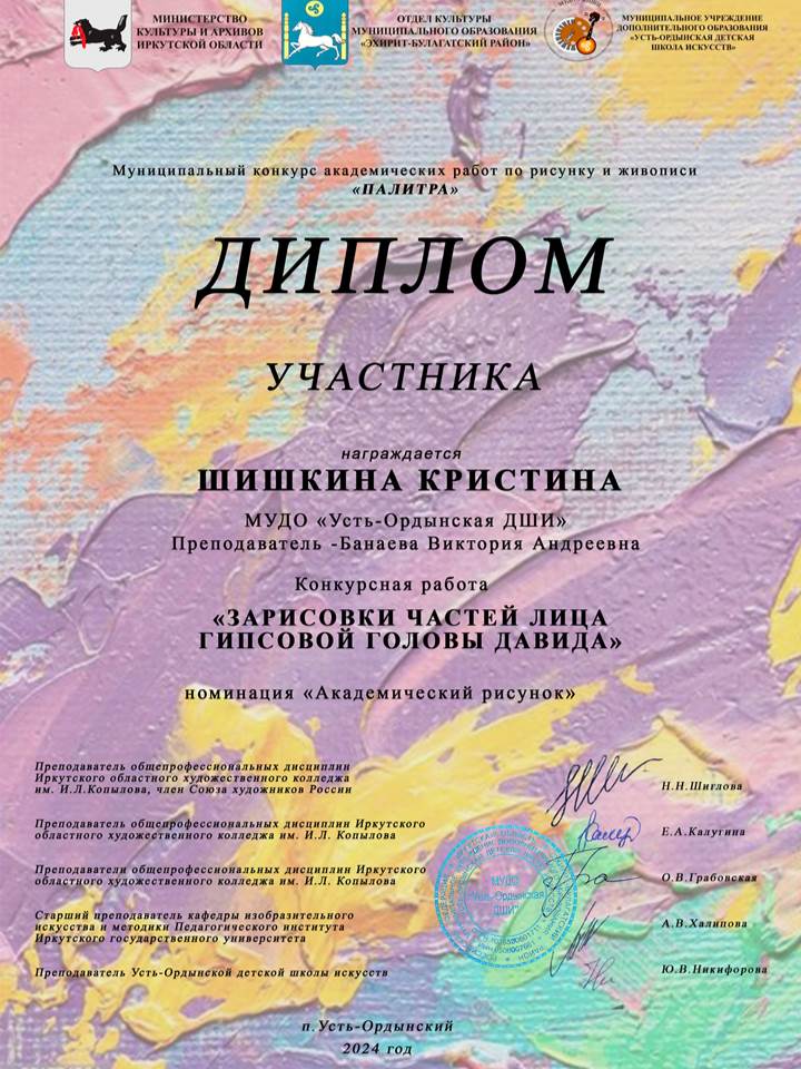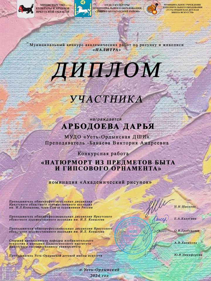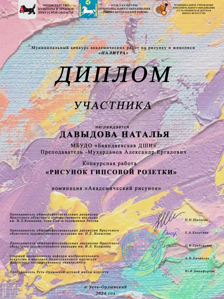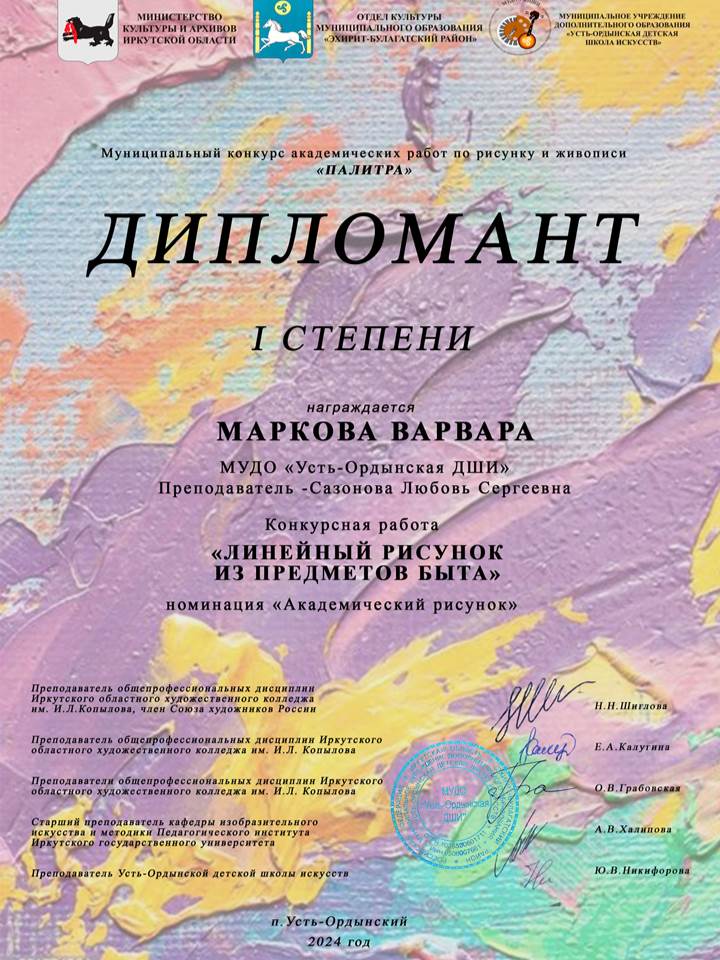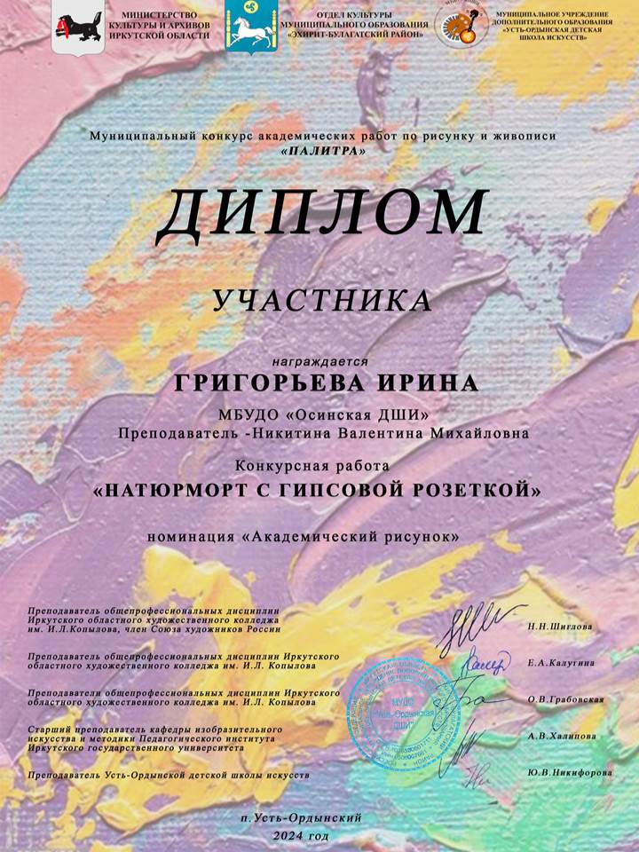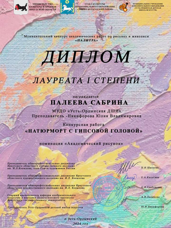 Дипломы Открытого муниципального конкурса академических работ по рисунку и живописи «Палитра»
