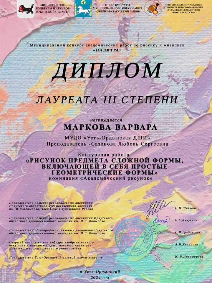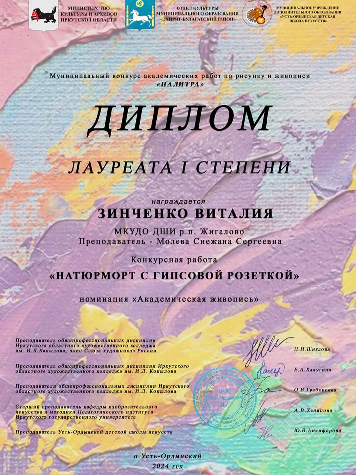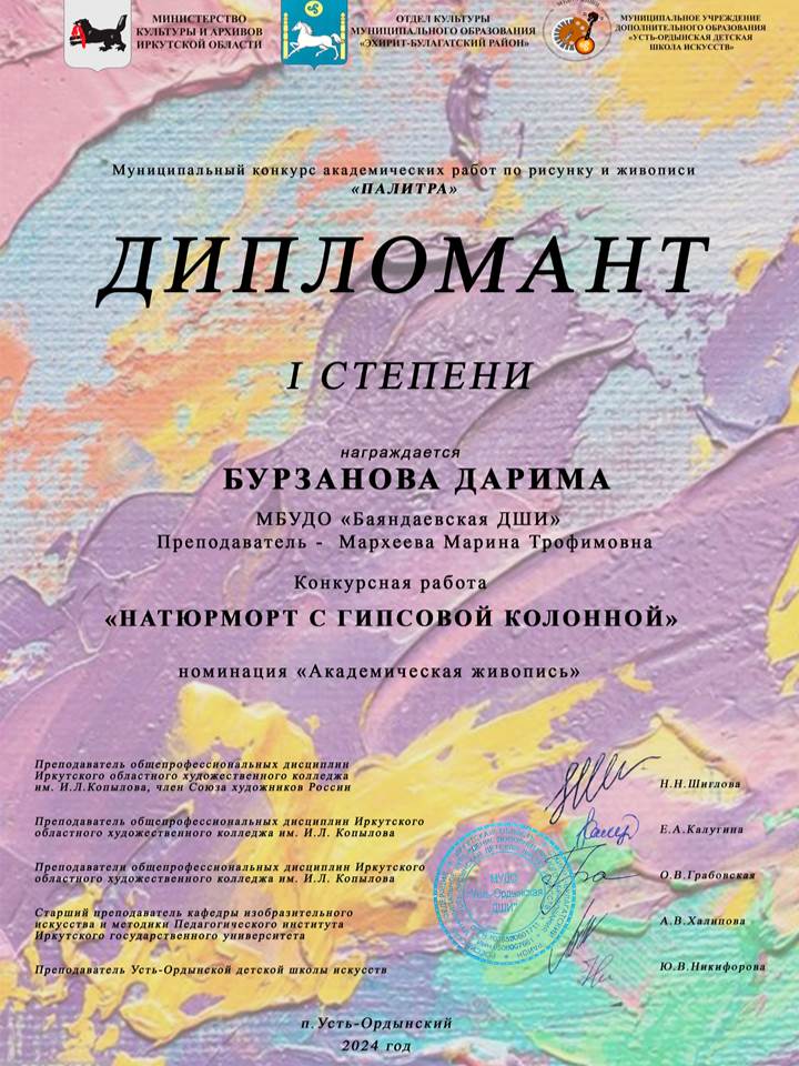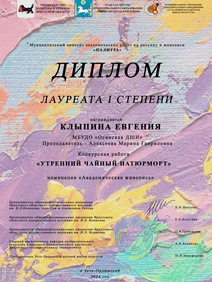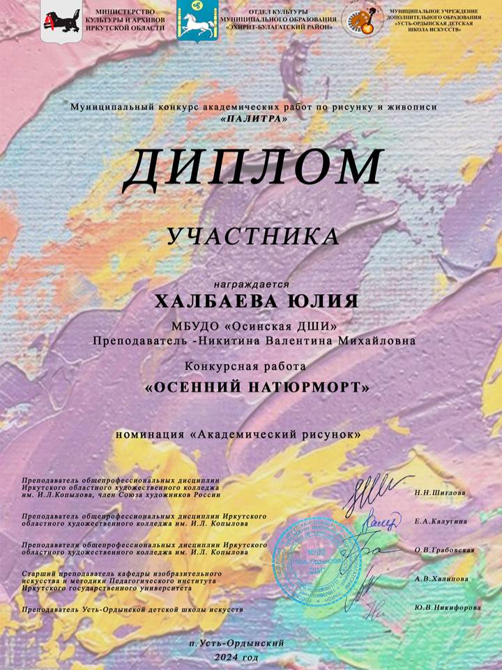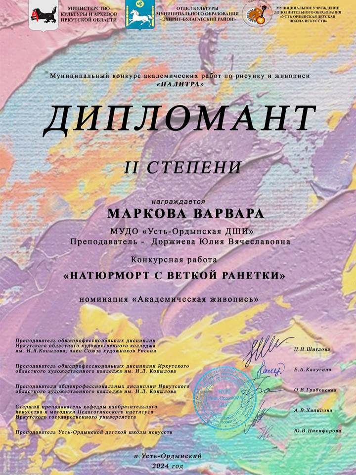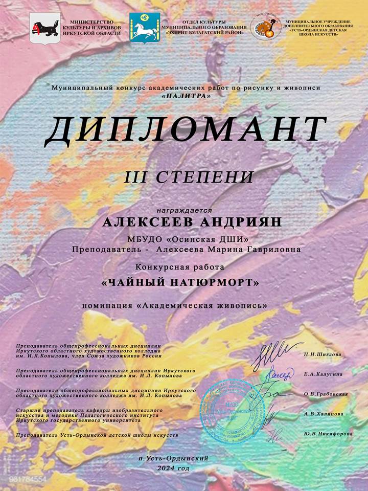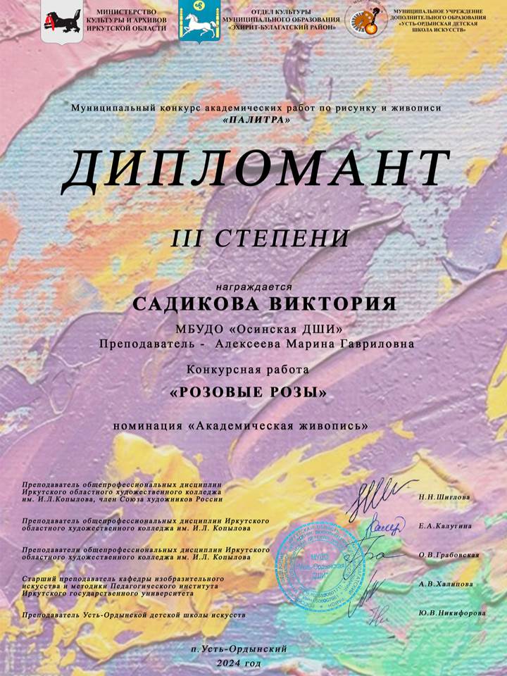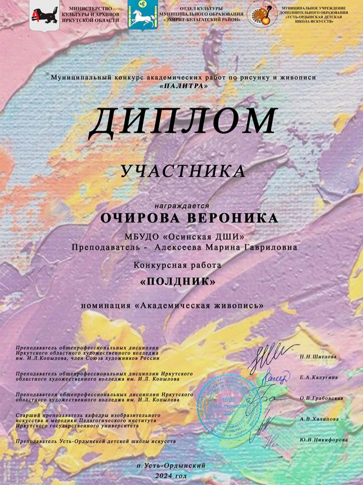 Дипломы Открытого муниципального конкурса академических работ по рисунку и живописи «Палитра»